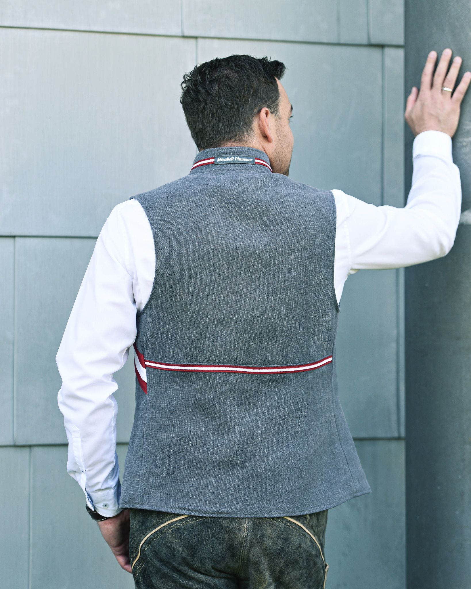 Dieses Gilet aus feinem Leinen-Gewebe, aus österreichischer Produktion, präsentiert sich als ein modisches und doch bodenständiges Statement. Die Bänder in rot-weiß-rot und das Wappen an der Vorderseite lenken den Blick auf die wunderschönen Silberknöpfe. Der Stehkragen und die Kaiserschleife in rot-weiß-rot setzen den unverkennbaren Mirabell Plummer Akzent.