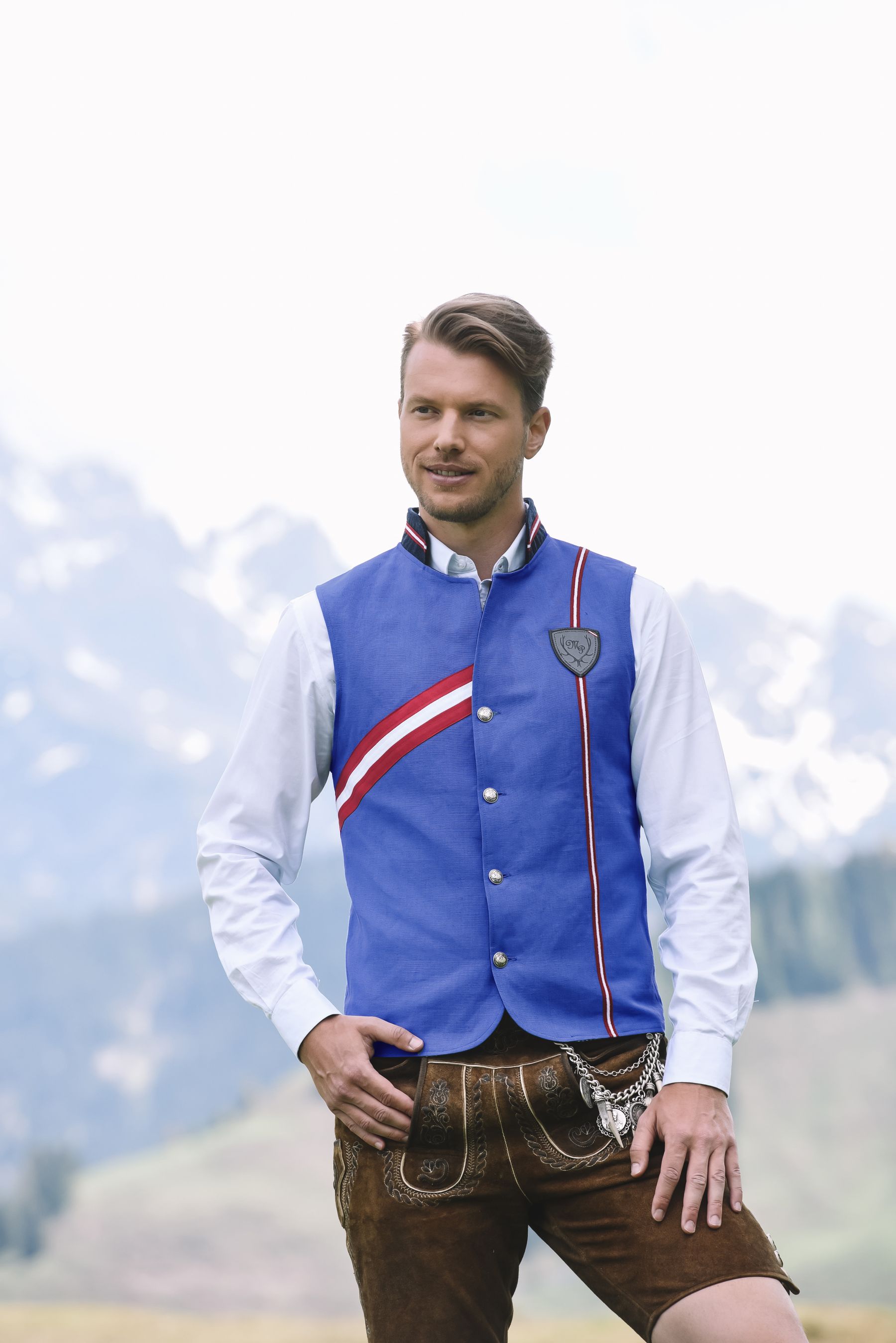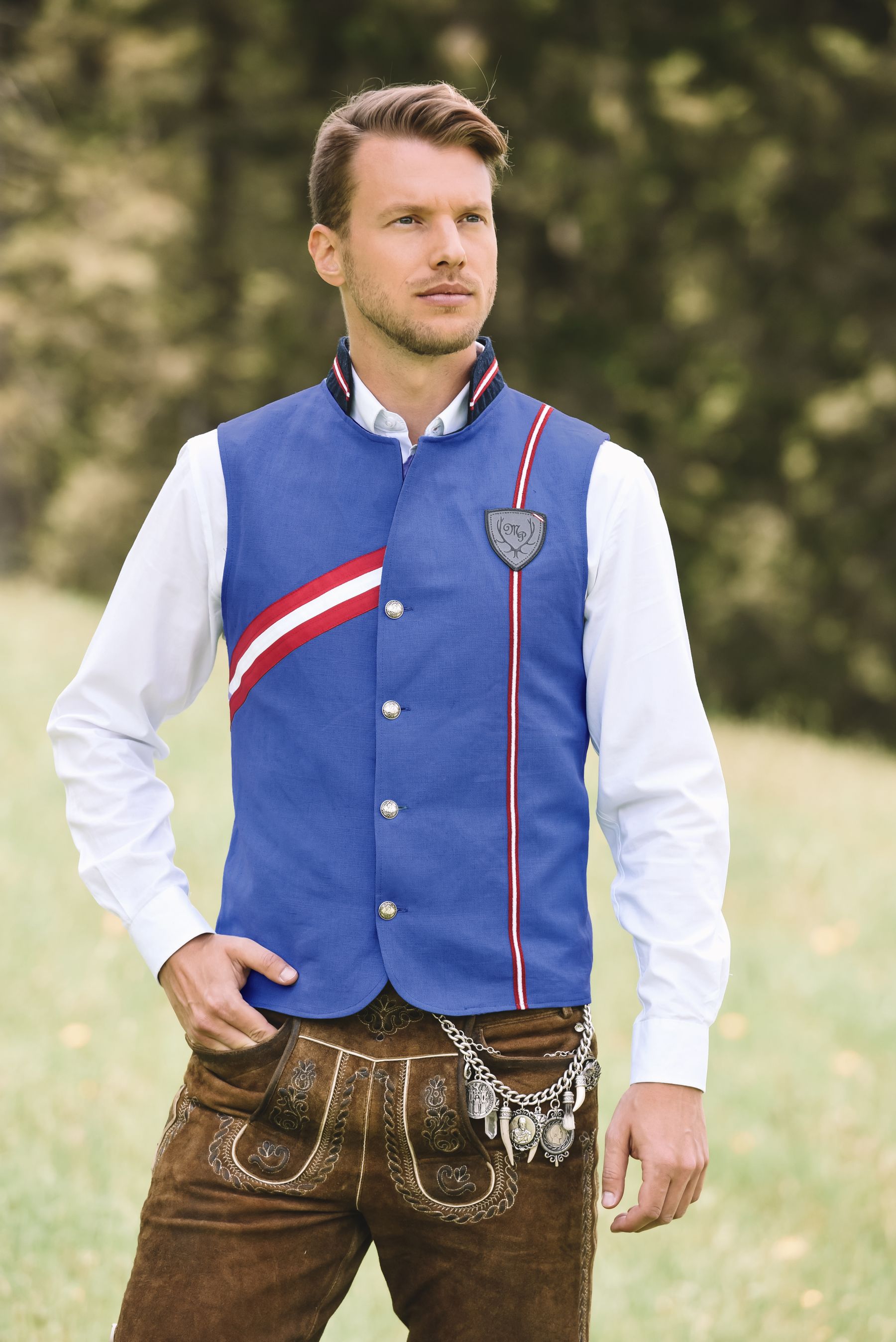 Ein Gilet aus edlem Leinen - so elegant und stilvoll wie der Gentleman, der es trägt. Dieses Gilet vereint gekonnt Klasse und Raffinesse, während es gleichzeitig unbeschwerte Leichtigkeit ausstrahlt. Die rot-weiß-rote "Kaiserschleife" und das Zierband setzen alpine Akzente und machen dieses Gilet zu einem zeitlosen Klassiker, der in keiner Garderobe fehlen sollte.